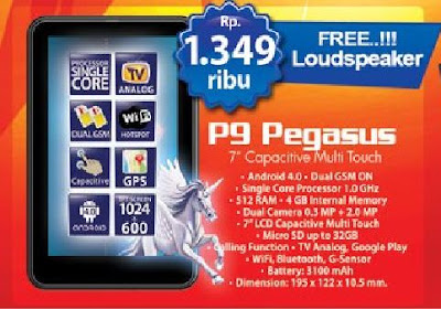Setelah meluncurkan Movi Max P5 Hercules beberapa waktu lalu, kini salah satu produsen lokal ini membebntangkan sayapnya lebih lebar lagi dengan memperkenalkan Movi Max P9 Pegasus, Tablet ICS 7 inci Dual SIM, Dual Kamera Dan Bisa TV. Sama seperti produk lokal lainnya yang memiliki banyak keunggulan namun dibanderol dengan harga yang murah, begitu juga dengan Movi Max P9 Pegasus.